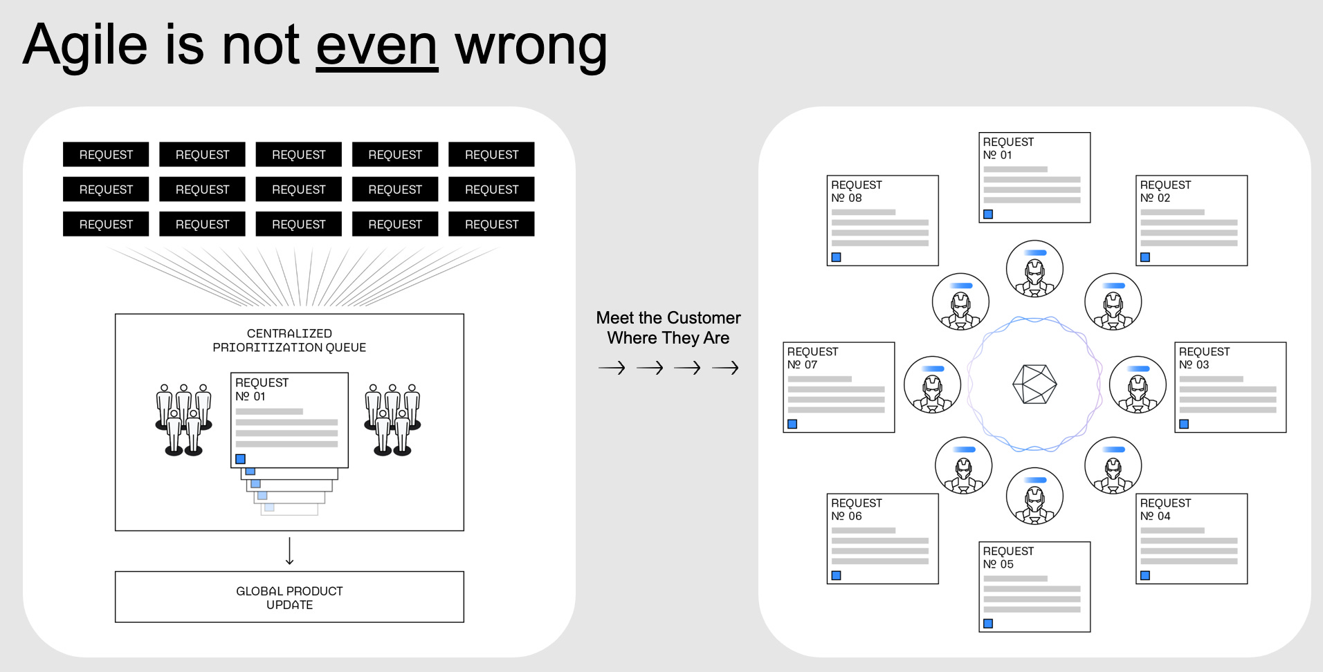 And in fact, there is no process or project management certification that can solve for this. Agile and Waterfall are both Soviet-style central planning processes, but we need to be embracing an entrepreneurial, American way of shipping code. The complexity of not just the user base but also the dozens of software vendors on the hook to deliver features can only be solved with a software infrastructure that is designed to massively debottleneck hyper distributed development.