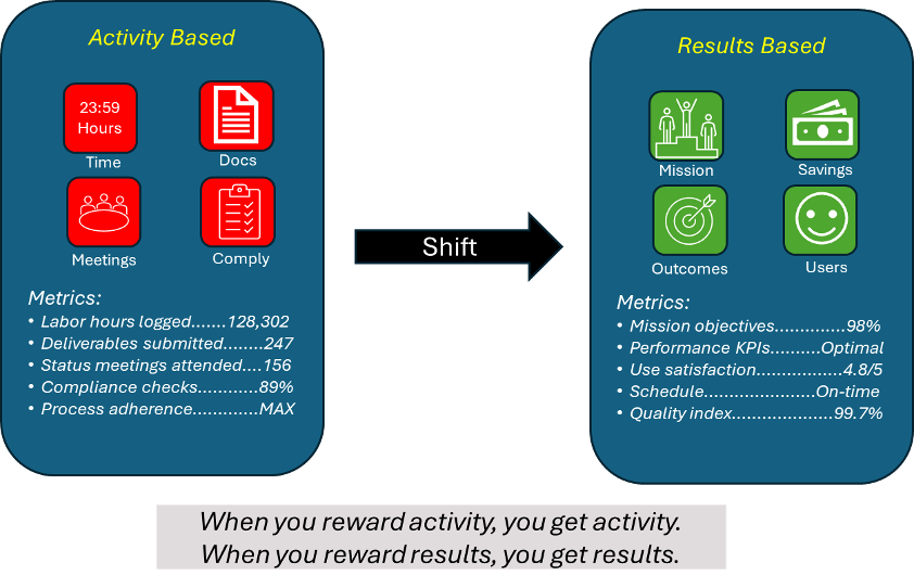 Rather than a measurement or management problem, this is an incentive problem. When success means billing more hours instead of delivering results, failure becomes profitable. Contractors earn millions producing activity, not outcomes, while accountability drowns in timesheets and compliance theater.