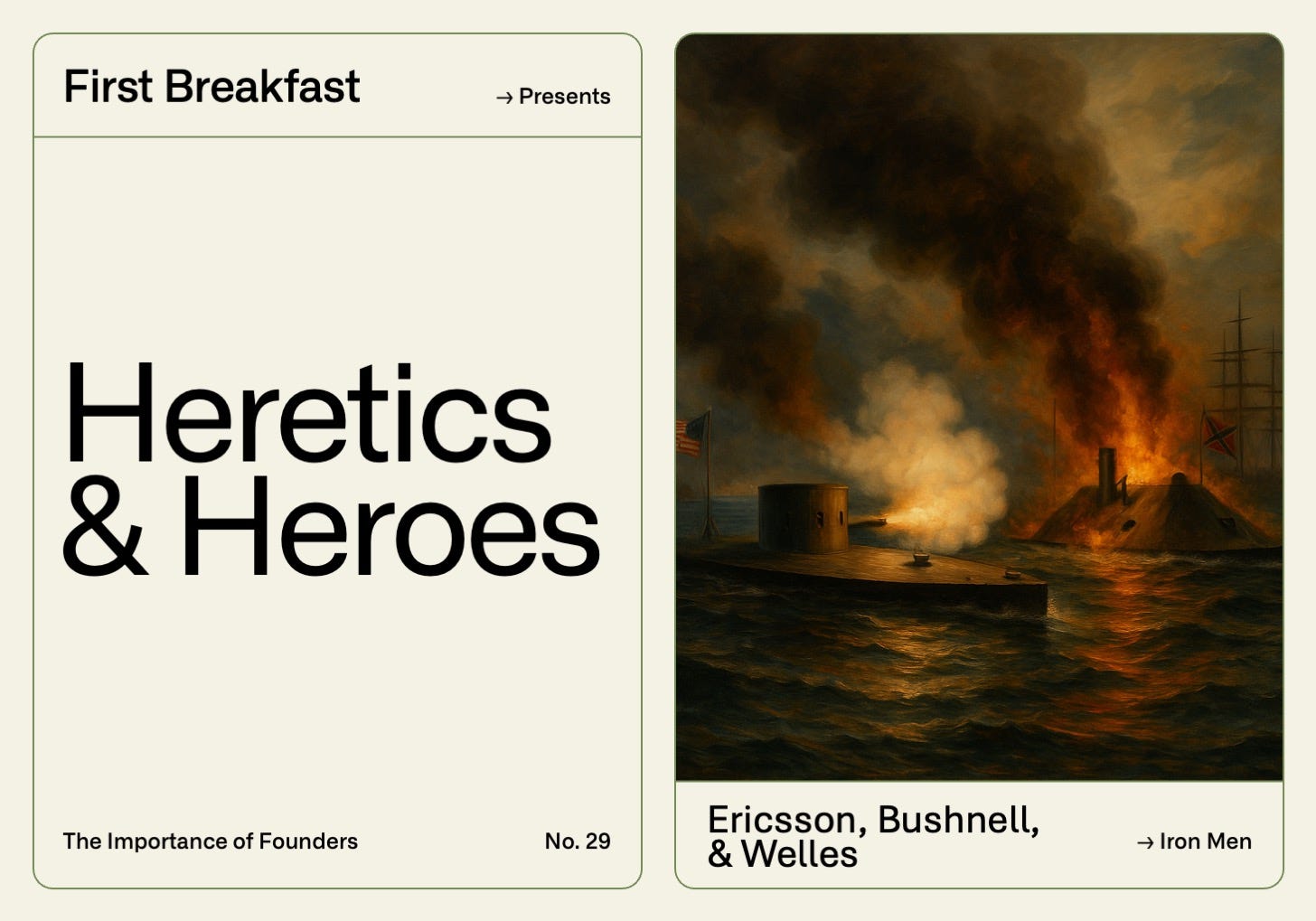 The success of the Monitor required all three men. Ericsson, the heretic, provided the breakthrough. Bushnell, the enabler, furnished the resources and savvy to hack the system. Welles, the bureaucrat, absorbed the risk and shielded the project from institutional resistance. Remove any member of this triumvirate and Ericsson’s ironclad design stays in its box—leaving the Virginia to destroy the Union fleet, ransom coastal cities, and perhaps bombard Washington itself.
