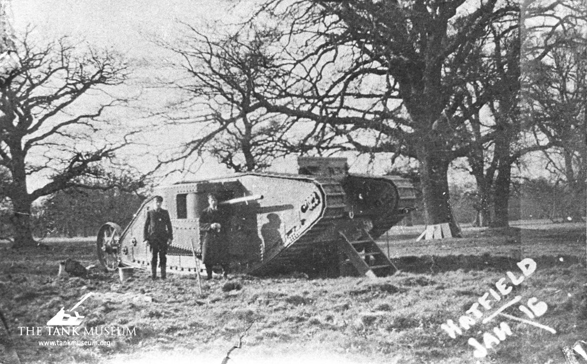 In January 1916, the first Mark 1 tank, christened “His Majesty’s Land Ship Centipede,” went through trials in Hatfield Park, to great success. Kitchener was on hand, but remained skeptical to the last. He left early, dismissing it as a “pretty mechanical toy.” Lloyd George saw more promise in the machine. He ordered 100.